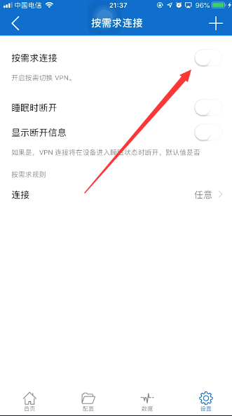 如图,点击下方的【设置】,找到【按需求连接】打开开关即可。