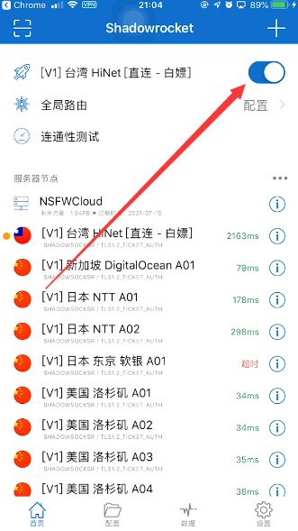 之后会自动返回到Shadowrocket界面并启用服务。