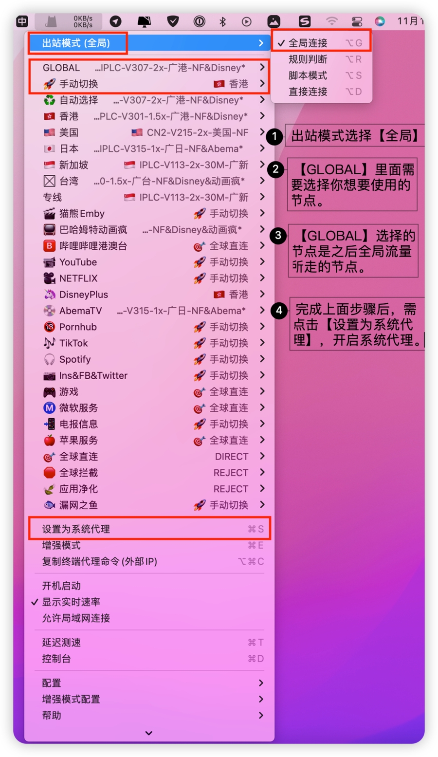 如果默认的分流模式您无法正常使用,可以按照下方图示开启【全局代理】。