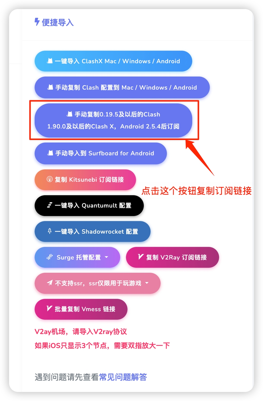 然后我们去官网首页,底部,便捷导入,复制订阅链接。