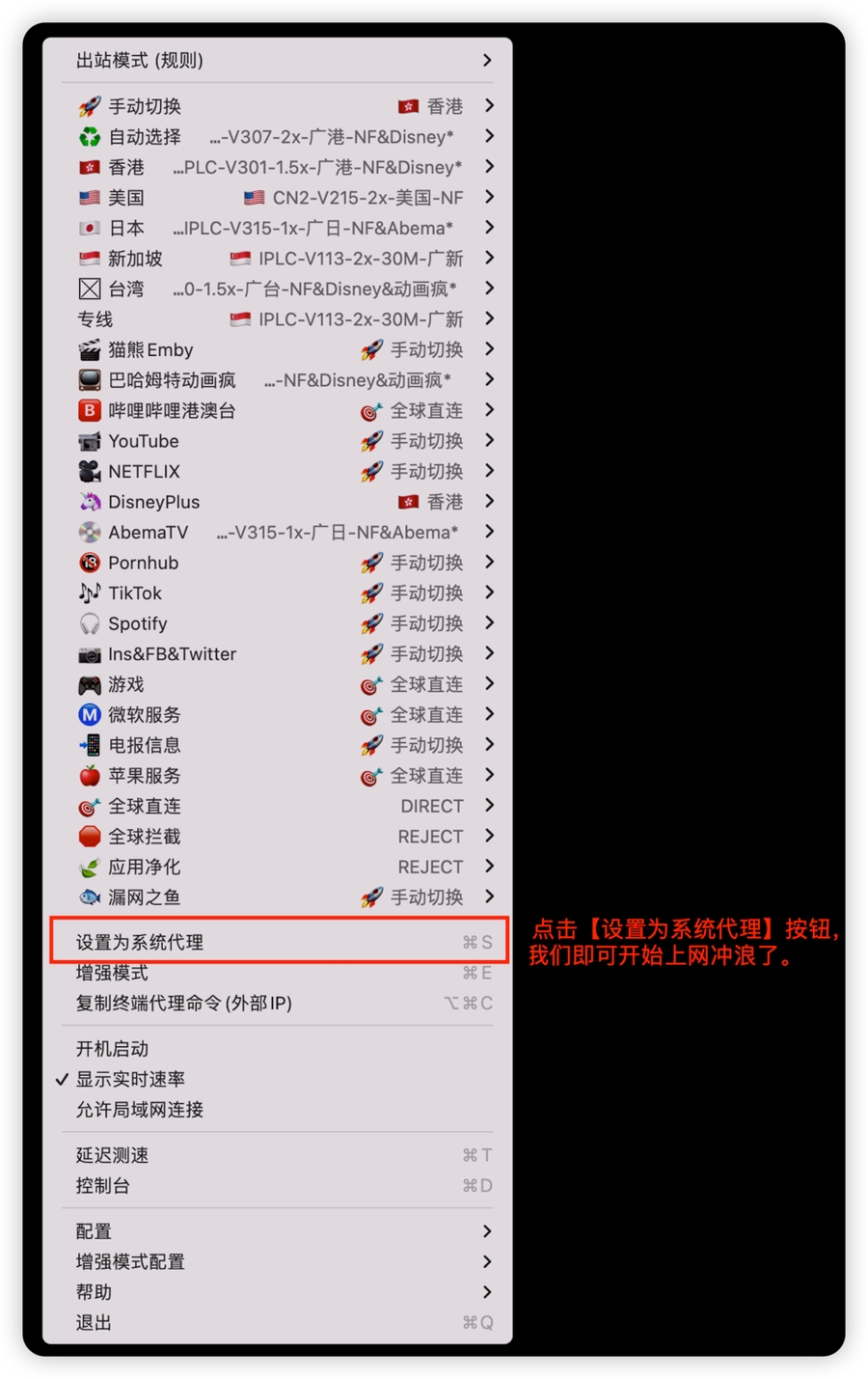 点击【设置为系统代理】就可以开始上网冲浪了。