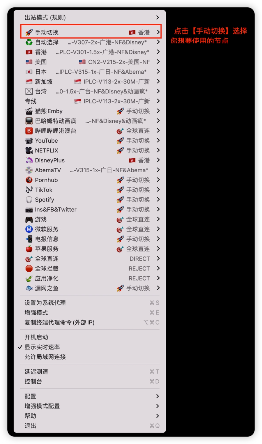 节点出来后,我们在手动切换里面选择需要使用的节点。